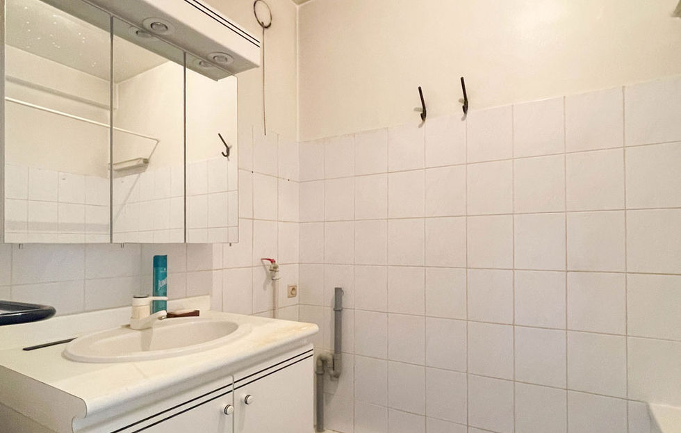 Salle de bain : 4,45m² baignoire, lavabo, miroir, radiateur.