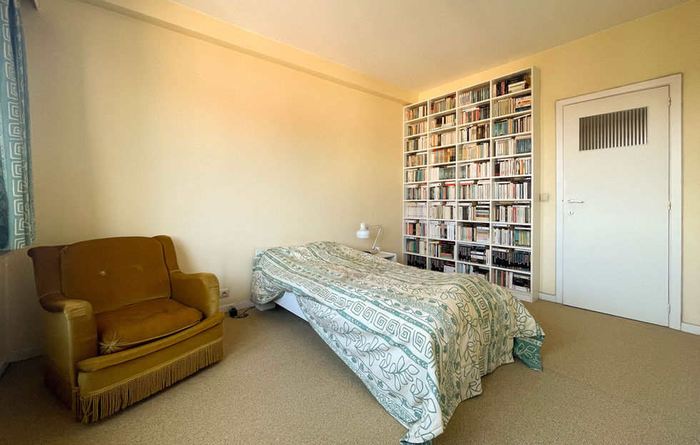 Chambre 1 (avant) : 15 m², moquette au sol, radiateur.